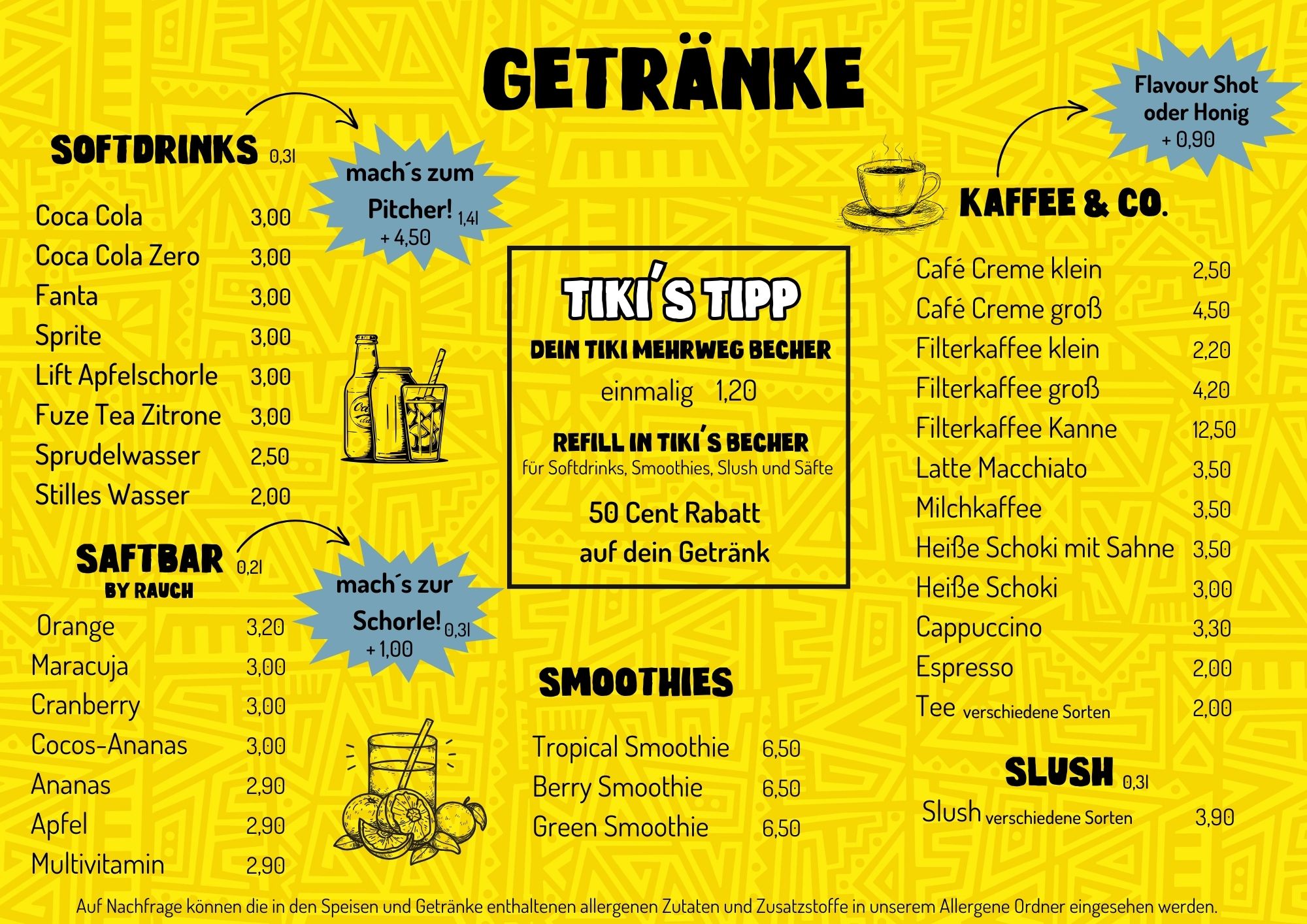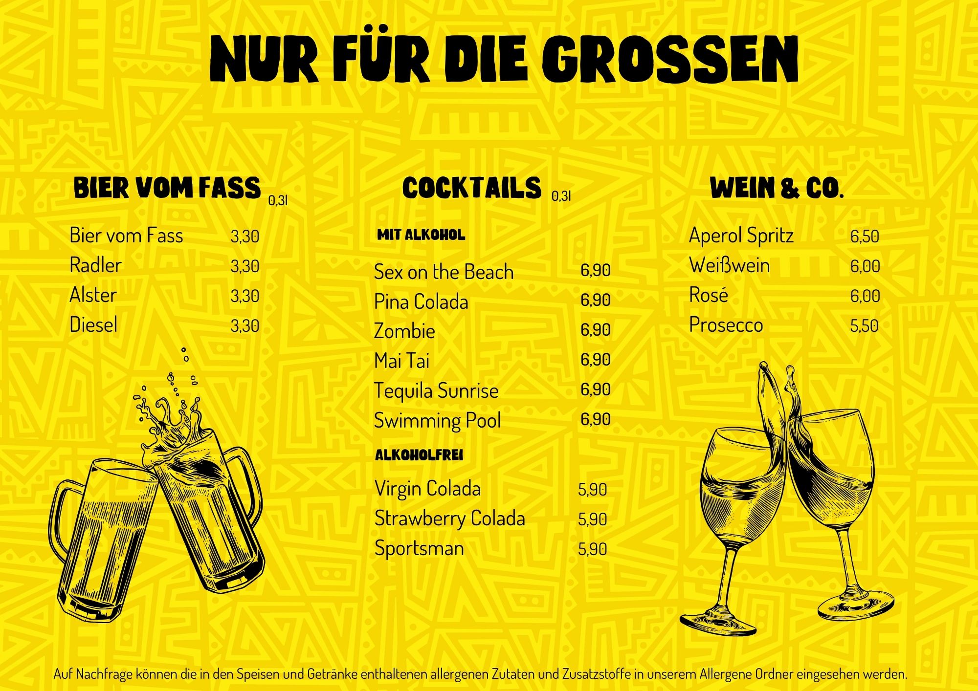 Das Angebot in unserer Bamboo-Bar ist für kleine und große Seeräuber und Meerjungfrauen ausgelegt. Für jeden Geschmack ist genau das Richtige dabei. Genießt unsere Kaffeespezialitäten, Softdrinks, Säfte, Cocktails, Speisen und Leckereien zu günstigen Preisen in Südsee-Atmosphäre. Besonders beliebt ist unsere große Eisinsel.